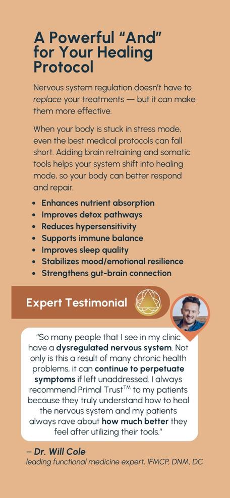 “Primal Trust™ helps my protocols stick. The clients get more out of all programs and protocols when their nervous system is regulated and Dr. Cat is living proof of that.”